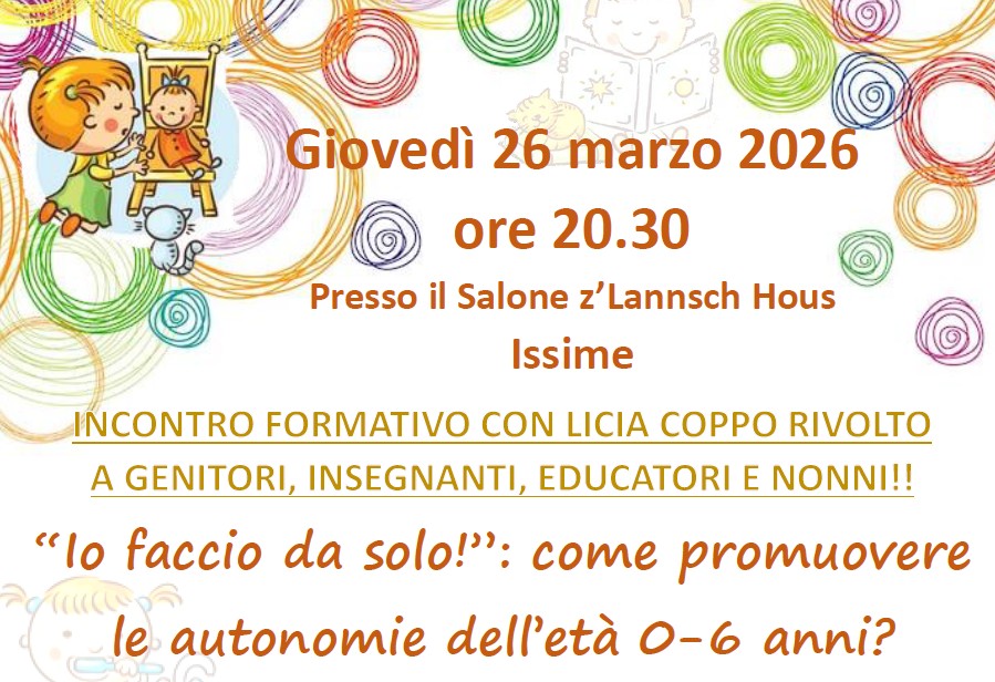 Si comunica che in data 26 marzo 2026 alle ore 20:30 presso il Salone Comunale di Issime si terra un incontro formativo rivolto ad educatrici, insegnanti e genitori con Licia Coppo.