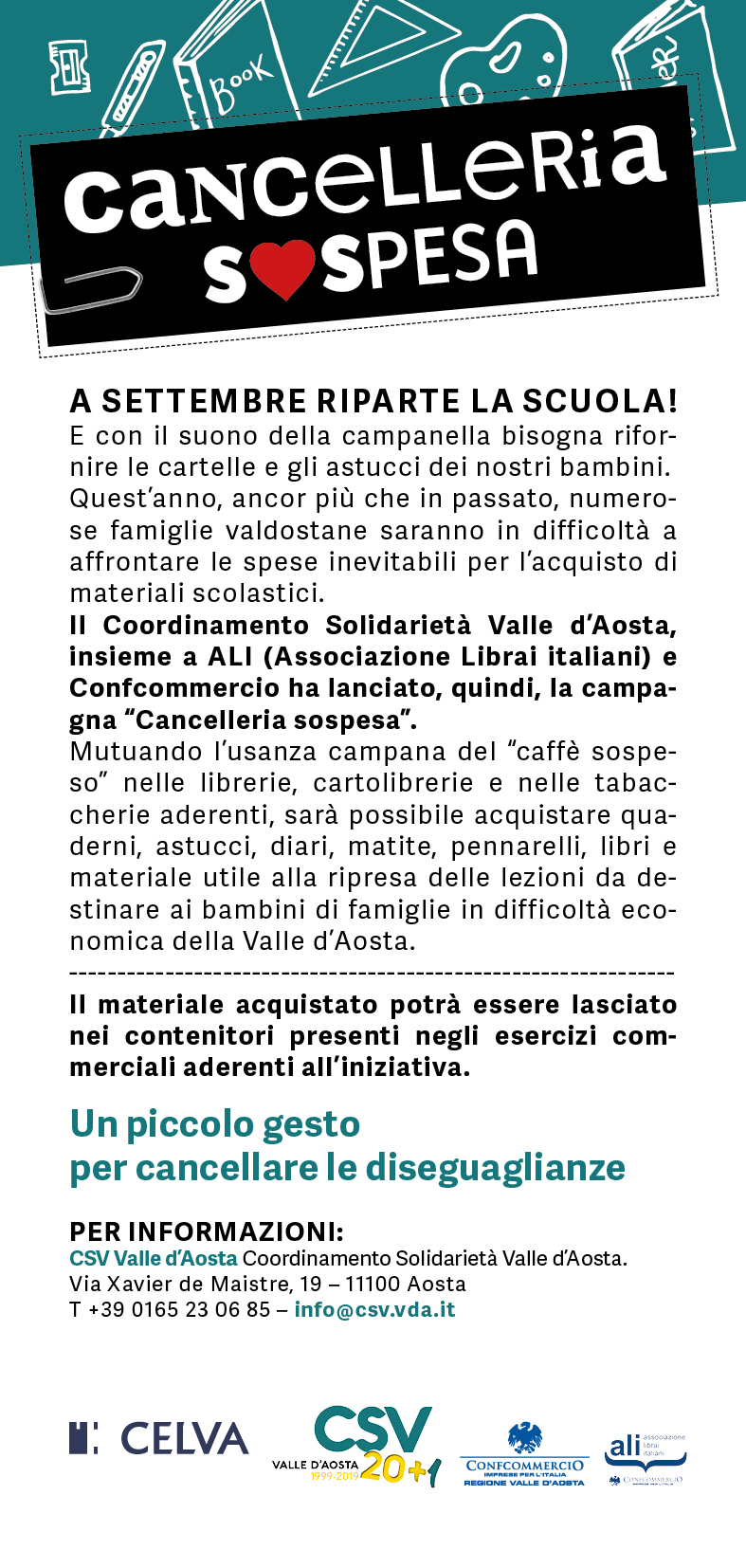 Le adesioni sono aperte, i punti vendita interessati possono contattare il CSV- Coordinamento Solidarietà Valle d’Aosta, oppure compilare il form online disponibile sul sito di Confcommercio Valle d’Aosta https://www.ascomvda.it/news/cancelleria-sospesa-aderisci-anche-tu-alliniziativa/