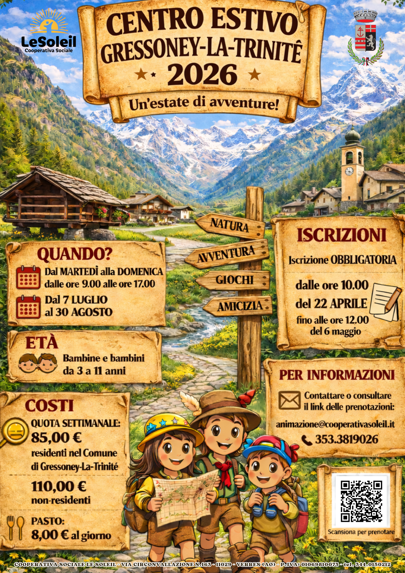 Il centro estivo si svolgerà per i bambini dai 3 agli 11 anni dal 7 luyglio 2026 al 30 agosto 2026, dal martedì alla domenica dalle ore 09:00 alle ore 17:00.