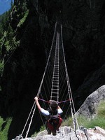 Percorso nero: dopo il ponte tibetano, anziché salire direttamente, scendere sulla sinistra (passaggio facilitato da un tronco incastrato). Dopo un breve traverso si incontra un secondo ponte tibetano (più piccolo). Alla fine del ponte risalire lo spigolo sovrastante. Un ultimo passaggio molto esposto e di forza su di un tetto strapiombante porta all’alpeggio Bodma.